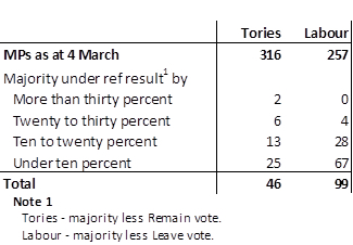The first week or so of the campaign is likely to be taken up with just such matters: positioning, electoral pacts, tactical voting – given the times, app- or social media-led. The table below shows that 8 per cent of Tory seats are vulnerable to a determined Remain push and 26 per cent of Labour seats to a concerted Leave drive.