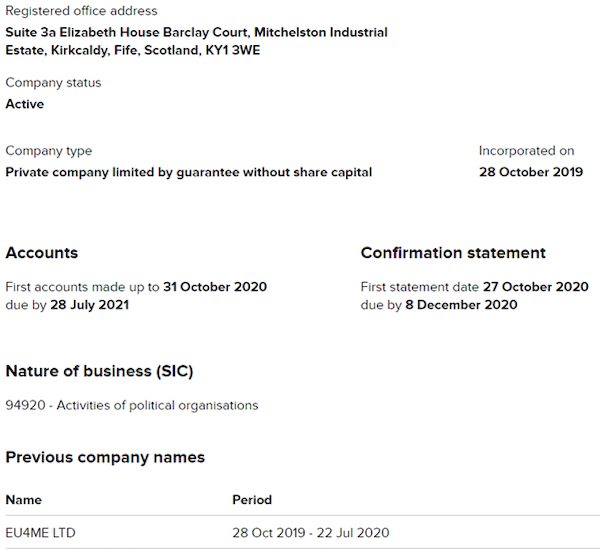 So, in summary we have a new company with a single director that wants to give the impression of being an independent campaigning group but is in fact closely related to the SNP. It has a website that is less than transparent (not unlike the SNP’s egregious National Survey) and at the time of writing breaches legal requirements. It must already have substantial funding (from unknown sources) but is seeking donations, precise purpose unstated. It maintains, in my view, a pretence of having UK-wide ambitions. It is Scottish through and through and knows its stated purpose can only be achieved by a separate Scotland.