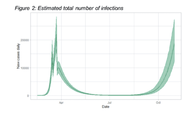 Much worse is that no MSP, academic or journalist has called out the First Minister and her scientific advisors for using data even dodgier than England’s. On October 7, when the First Minister announced a raft of stricter restriction on hospitality, she referred to an “Evidence Paper” produced by the Chief Medical Officer, Chief Nursing Officer and National Clinical Director which was simultaneously published. The key metric in the paper was a graph below showing that “at the current rate of growth (7 per cent increase per day), the number of infections would be at the level of the March peak by the end of October”. (My emphasis.)