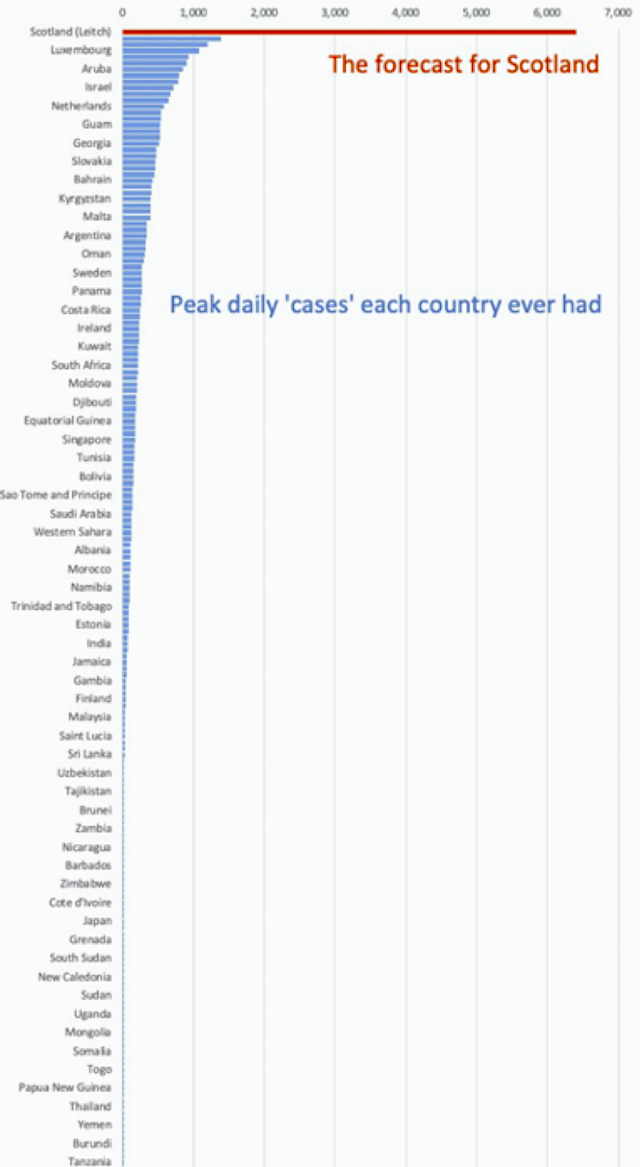 Hindsight aside, the modelling proposed by Leitch on October 7 was prima facie absurd, as this comparison of the forecast for Scotland with other countries’ peak daily cases shows:
