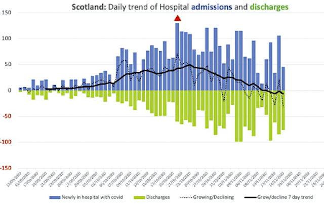 Finally, here are two graphs depicting hospital and ICU admissions and discharges since early September, which indicate a clear downward trend against the First Minister’s doom-mongering.
